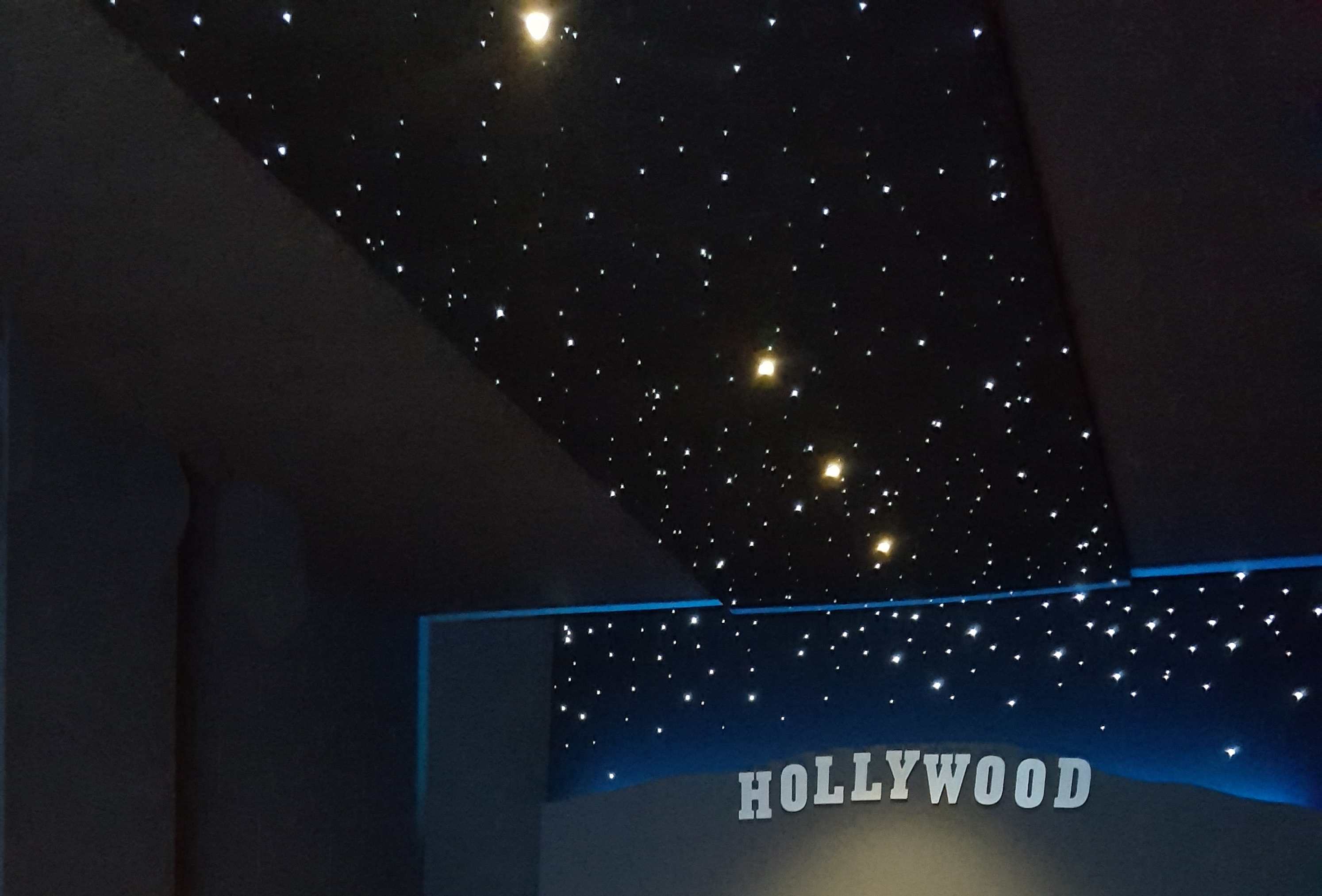 A 3-D backlit sign with cove lighting creates a glow on that iconic Hollywood horizon line. Overhead, a star filled ceiling wraps over cozy theater seats.