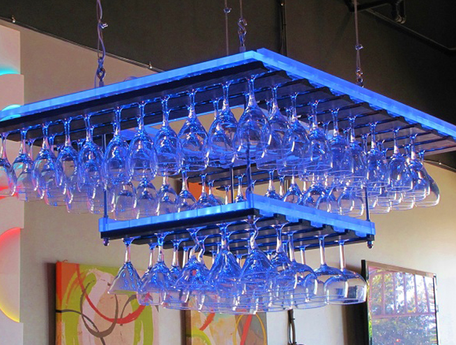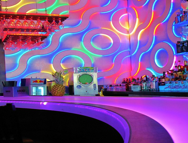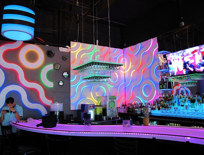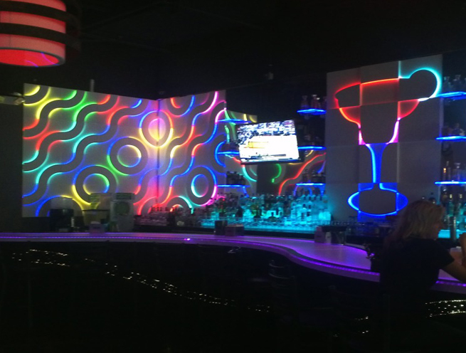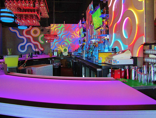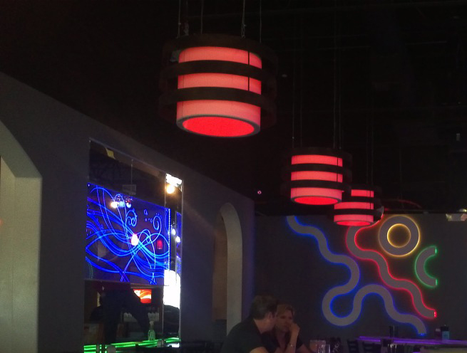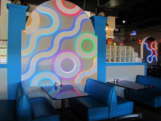 Our designers and lighting experts came up with a plan to bring color and excitement to this bar and restaurant by using color changing LED lighting and custom 3 dimensional galaxy walls as well as bright and colorful accents from custom hanging light fixtures to edge lit acrylic and a glowing color changing bar.