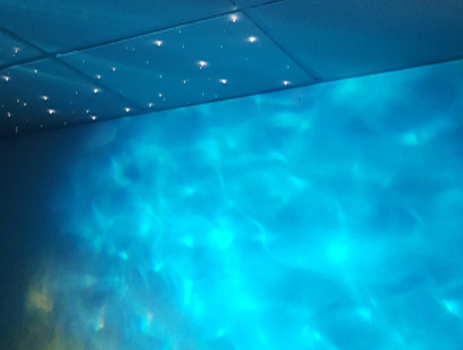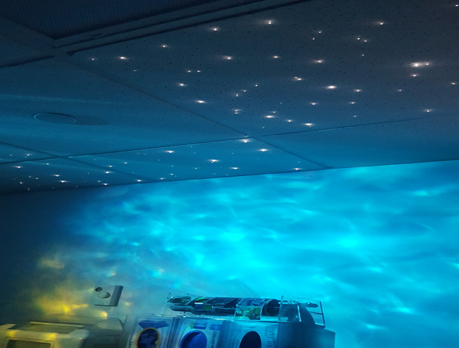 This project was designed to keep little worried minds distracted while being surrounded by intimdating machines in unfamiliar surroundings. Using twinkling star panels and projected lighting, this treatment room was transformed into a calming environment.